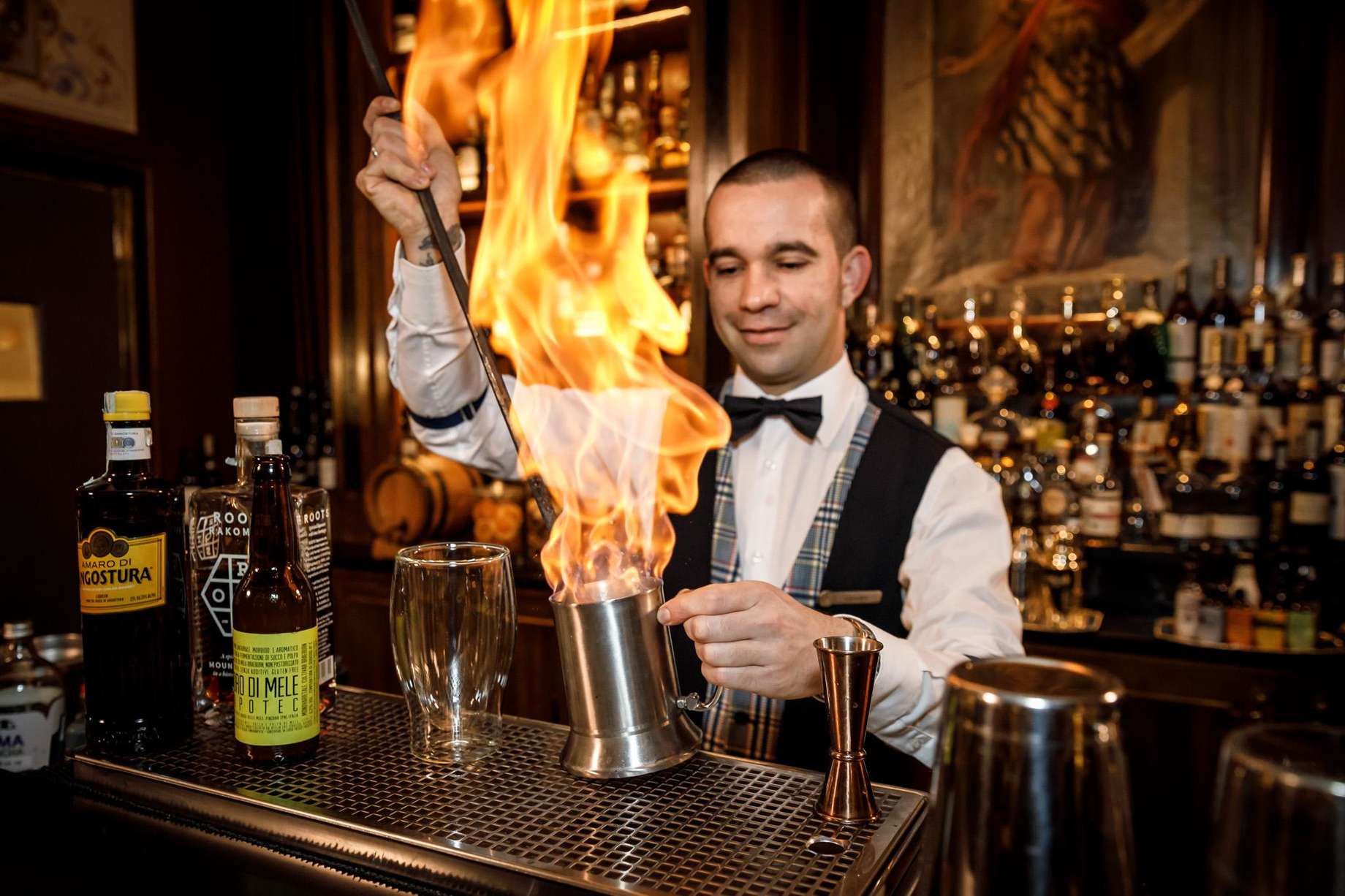 Tableside cocktails in a dark hostel bar
