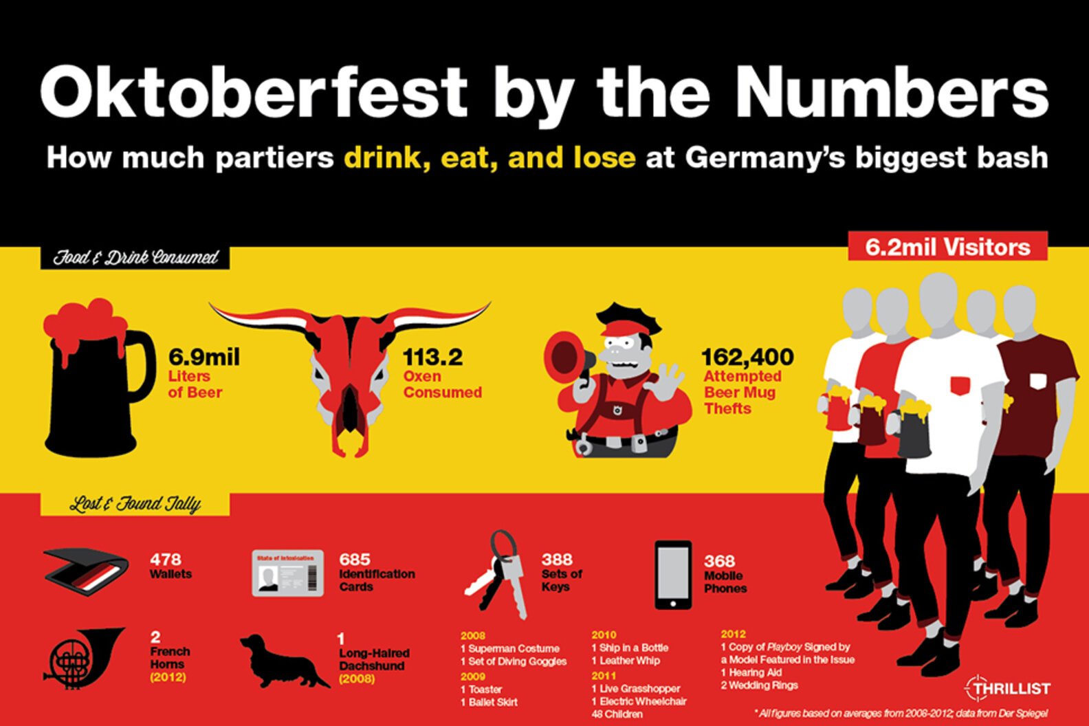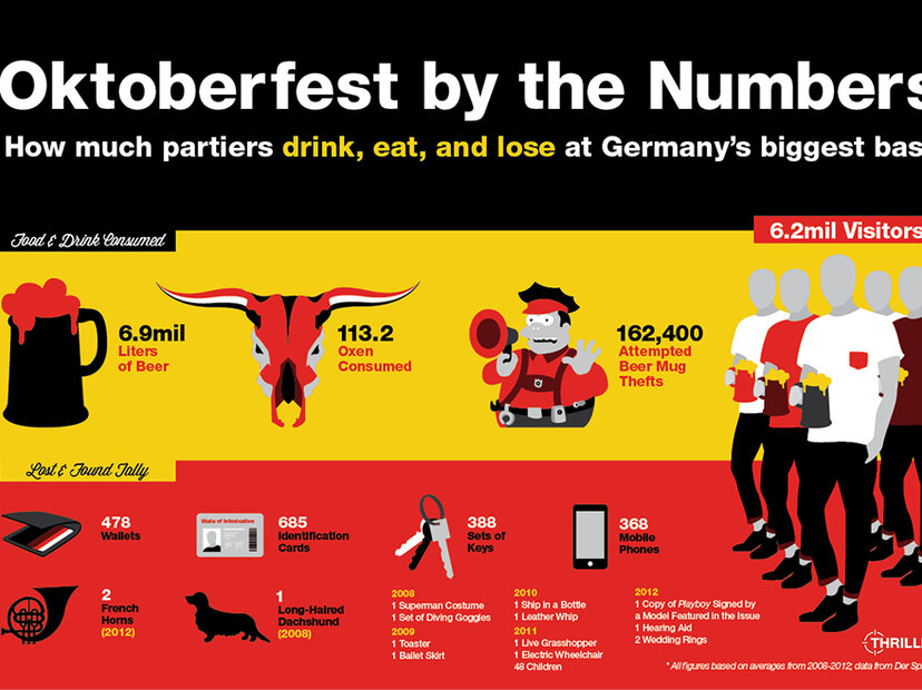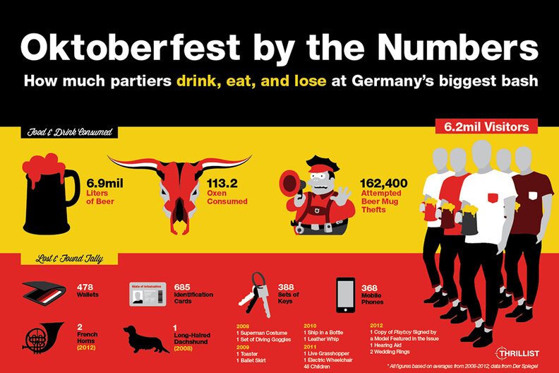 Every year, millions of revelers decked out in dirndls, lederhosen, and terrible fake German accents descend upon Munich for Oktoberfest. And every year, a bunch of spectacular and hilarious stats come out of the two-week party, this year's version of which fired up on Saturday.We gathered some of the best Oktoberfest stats from the past five years, including tankards housed and IDs lost, for your entertainment. Check 'em out below, but please: if you are attending Oktoberfest this year, keep an eye on your toaster.
