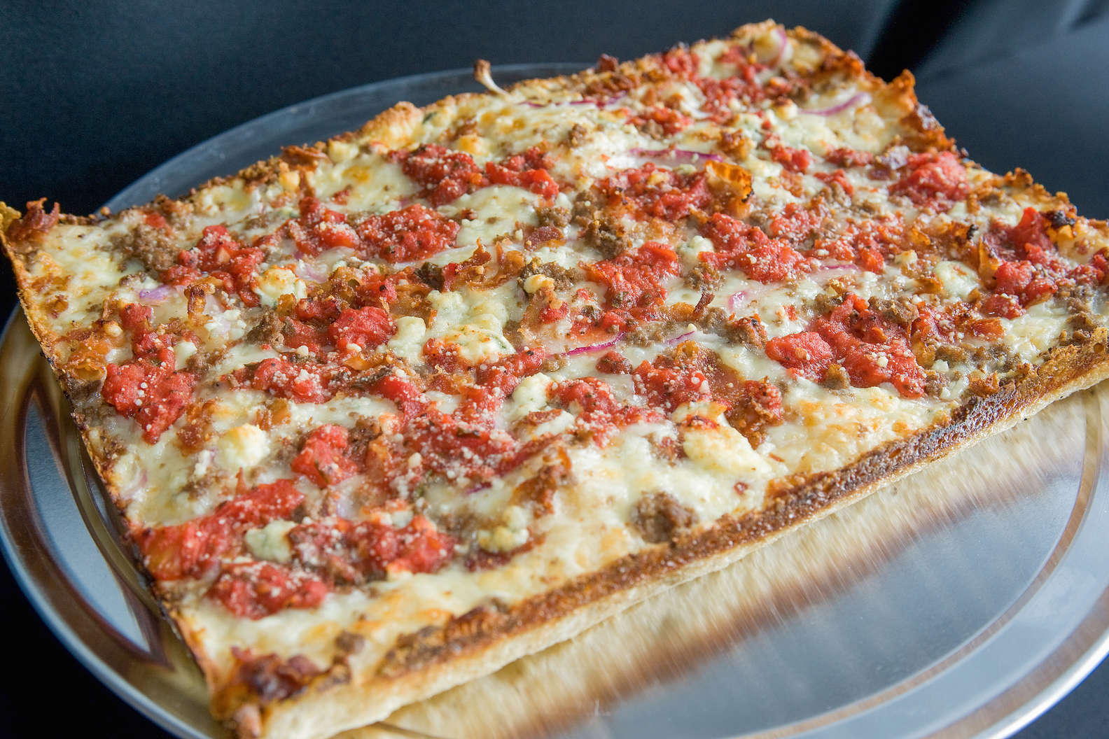 From the Sicilian dough and the rectangular trays, the toppings go directly on top of the dough; the pizza is then piled over with high-fat, semi-soft Wisconsin brick cheese all the way to the edges of the pan, melting over the sides of the crust and caramelizing, bubbling up nice and brown on top and melting in the middle. It gets another layer of toppings after that, and, lastly, the final touch: streaks of thick red sauce over top. The result is a dense deep dish that still manages to be light and airy, packed with flavor and plenty of the coveted corner pieces to go around.