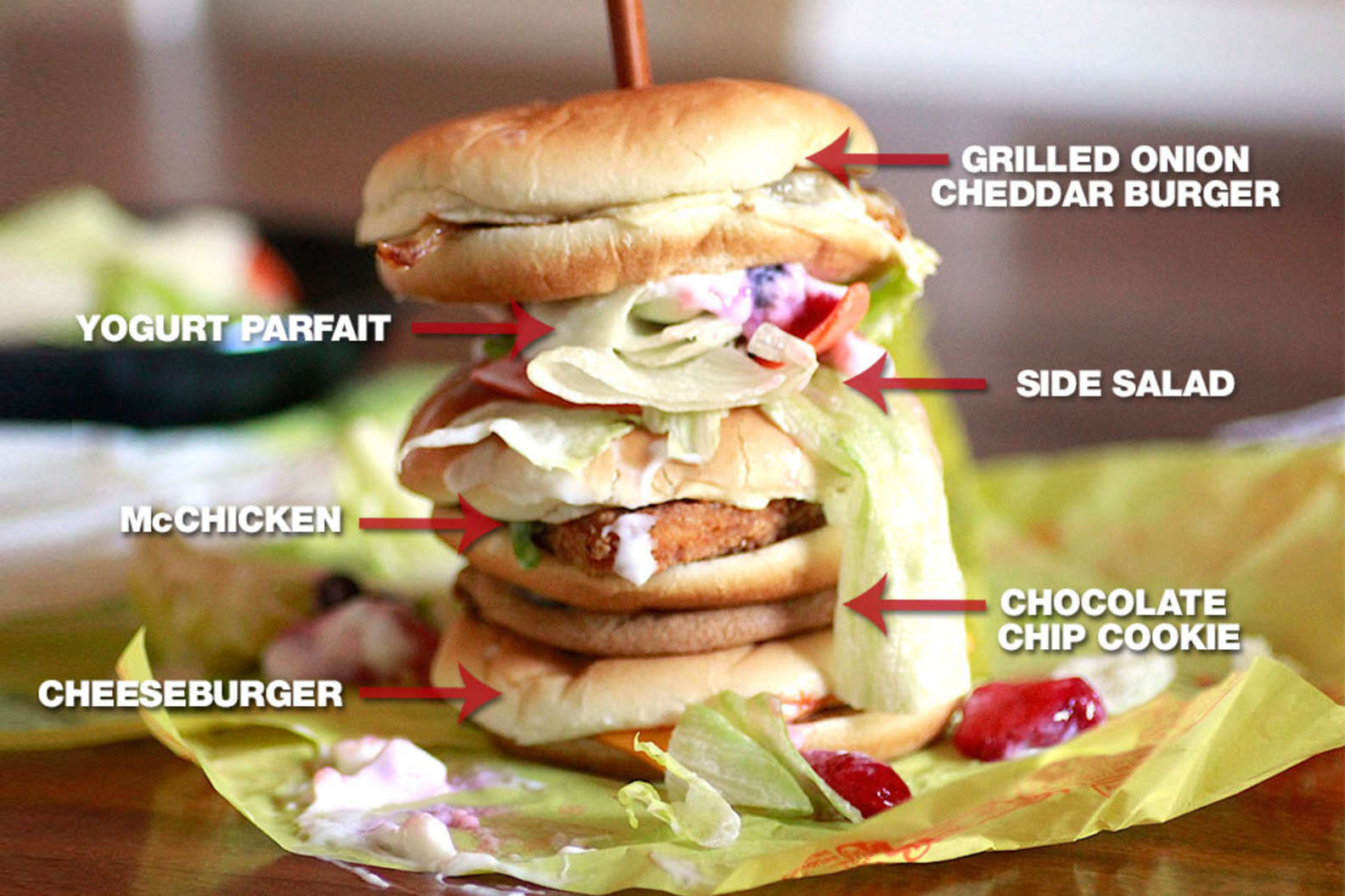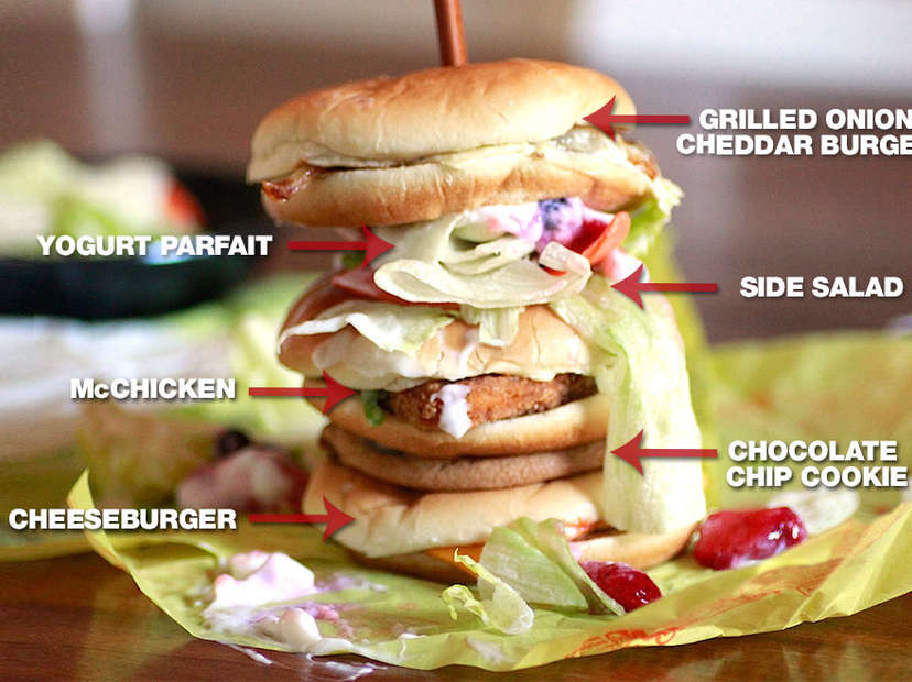 Conclusions, Epiphanies, Etc: The result? A beautifully weird symphony of fake-tasting stuff. The salad had no flavor, but the vanilla yogurt paired oddly well with the salt from the burgers and the pepper from the McChicken. Then the chocolate/meat combo hit and it was over... this was one of the grossest combinations of grease and sugar since the Jersey Shore crew worked at an ice cream shop. Heyooo! That said, we finished it. Because we never thought we could do this again, and thankfully we were wrong.