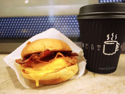 The breakfast menu also includes coffee and tea because, you know, commuting just isn't commuting without having to juggle a hot coffee cup on a crowded platform, too. But who are we kidding? All that actually matters is which breakfast sandwich you choose.