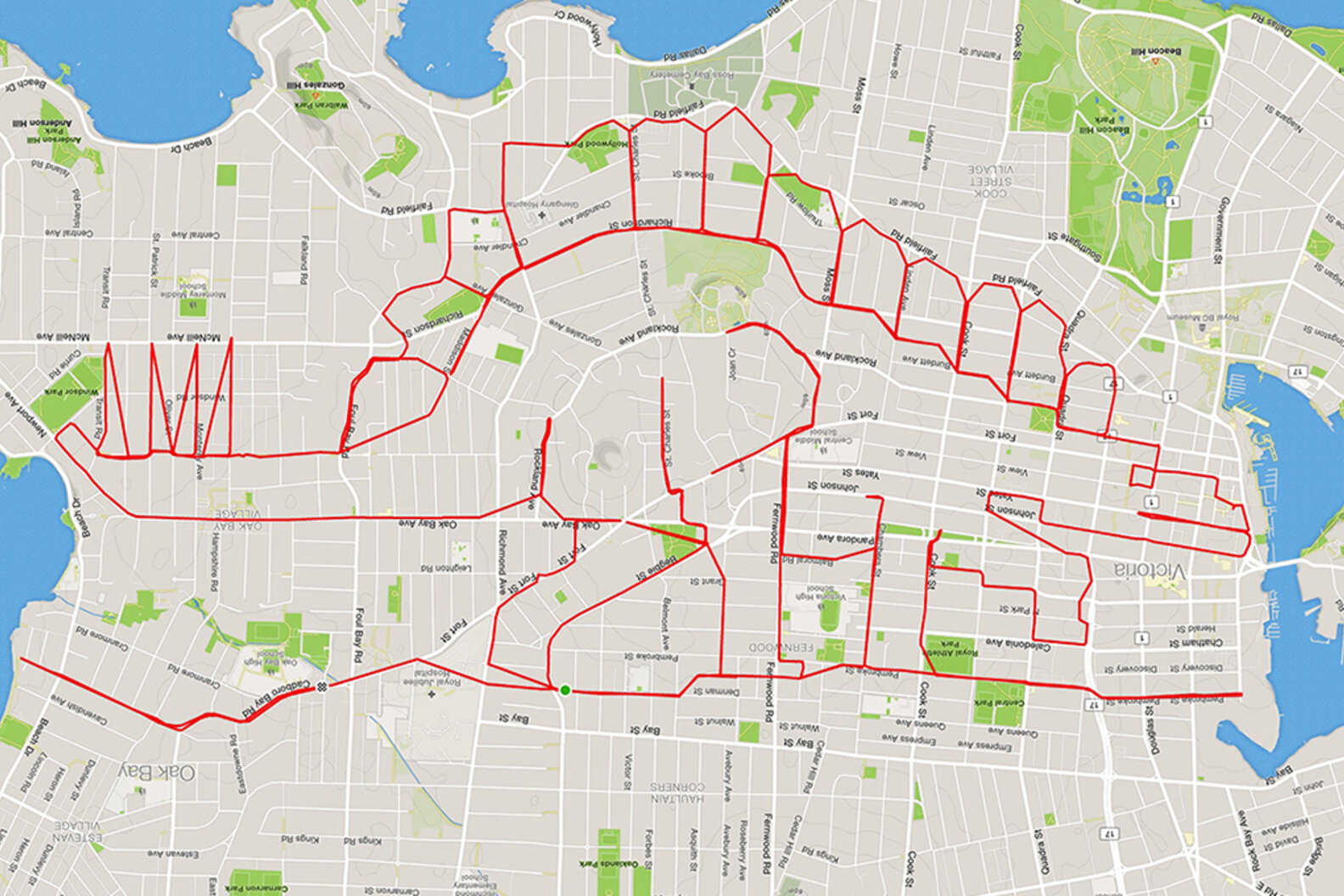 Lund first experimented with GPS doodling early on the morning of New Year's Day 2015, when he biked a path spelling "Happy 2015!" through the streets of Victoria, Canada, according to his website. Since then, he's used the Strava mobile app to create several large-scale doodles of things like a giraffe, a stegosaurus, Darth Vader, Gandalf the Grey, and even Queen Elizabeth, among other doodles.