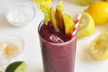 Starring beets, purple carrots, sweet potatoes, and other nutritious greens, this spin on the tomato blend will help you bounce back from Saturday night’s shenanigans. Shake things up here!Key ingredients: