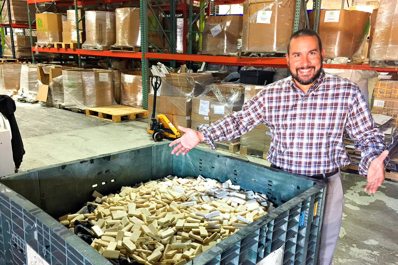 The first and largest plant is in Orlando; others are in Las Vegas, Hong Kong, Montreal and India. The bins arrive in the giant, fragrant warehouses. There the hotel soaps meet reject soaps from cosmetics bigwigs like Unilever. Workers then melt down the soap, reform it, and pack the new bars into boxes that they send to NGOs and charities like the Red Cross and Salvation Army.